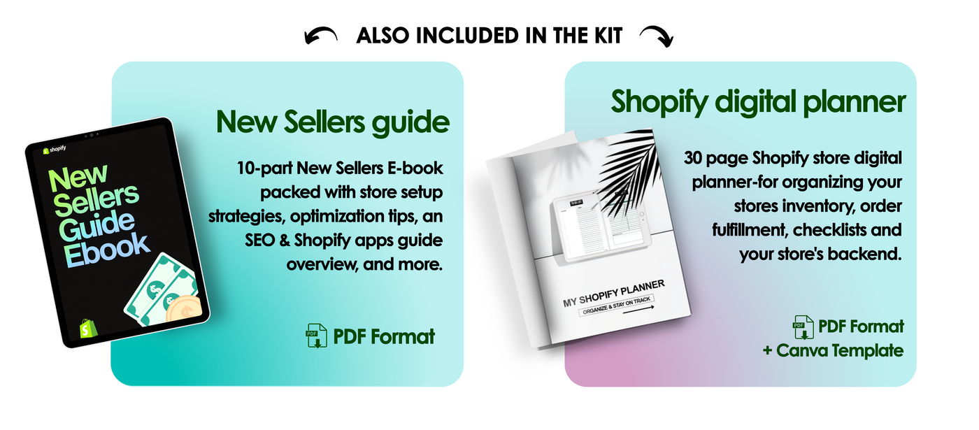 This all-in-one Shopify Starter Bundle is built to give beginners a serious head start. You’ll receive a complete 11 part video-walkthrough to help you set up your store, a powerful 10-part New Sellers E-book packed with store setup strategies and optimization tips, and a 30 page Shopify store digital planner-for organizing your stores inventory, order fulfillment, checklists and your overall store's backend.