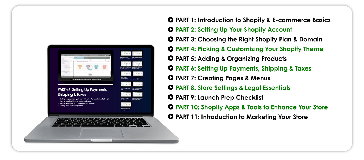 • 11-part video collection (Shopify walkthrough & website setup process)